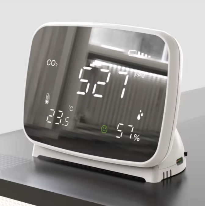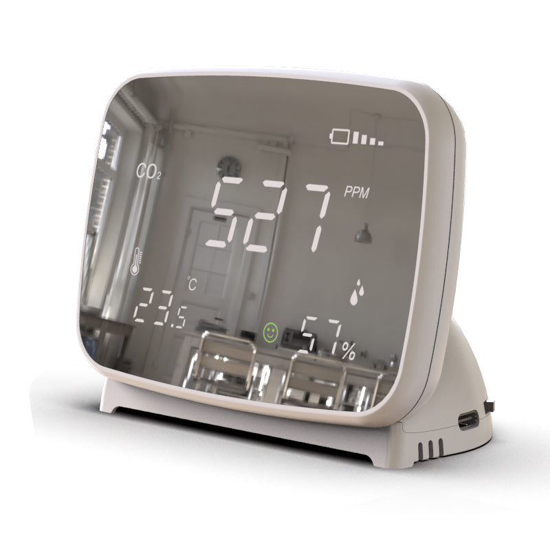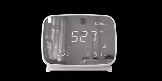 The CLARITY1 includes three sensors: NDIR CO2, Temperature, and Humidity. Application examples are residential, educational, and office buildings. This product features high accuracy sensors, clear LCD display, and MIRROR like screen design for aesthetics.